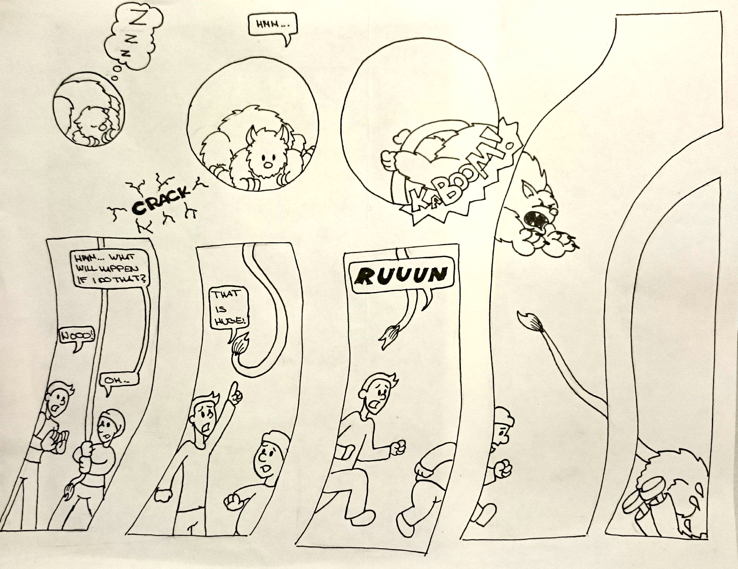 A simple activity – and a blast do do with students. Here are the instructions: Person 1 draws a blank composition. Then passes it on to Person 2, who writes in the text, adds word balloons, caption boxes, sound effects – anything to do with words – but no drawing! Finally, it goes to Person 3, who draws the images in each panel and finished the page. First step maybe give about two to three minutes, step two maybe 5-7 minutes, and the final step, 15 if you have it, or often we do the final step as a take home. This is one of a typical sequence of activities I do for public workshops, you can see a list of activities for my comics workshops to try yourself here.