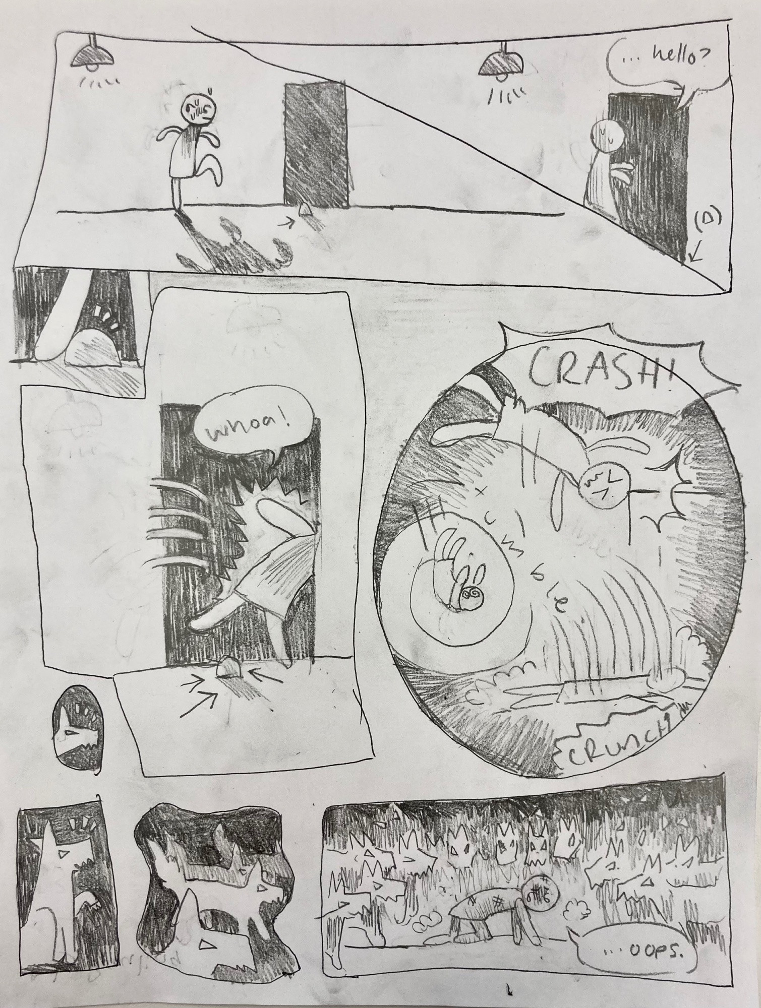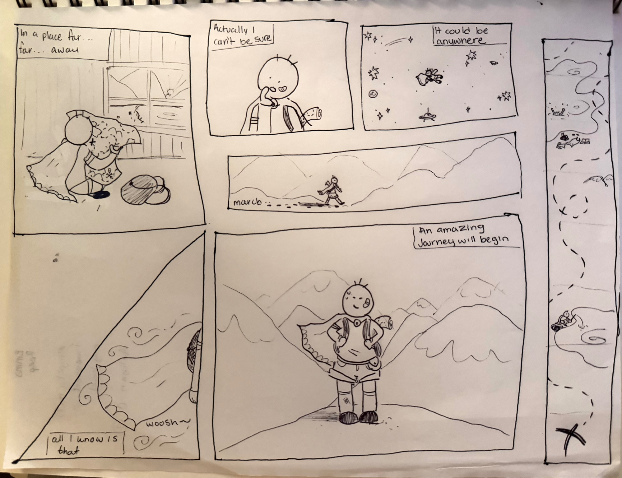The example above was generated in this fashion – one of the most amazing single page comics I’ve seen! I posted more examples below that were pretty cool. The first time I tried this, we did the drawings second and the words third. That was ok, but not as quick and we found it to be less generative than with the drawing last, and I’ve continued to do it this way ever since. I did this once over social media in March of 2020 as #CollabComics and maybe will do again (see that here). But for now – here are some examples, give it a try with friends or family! – Nick