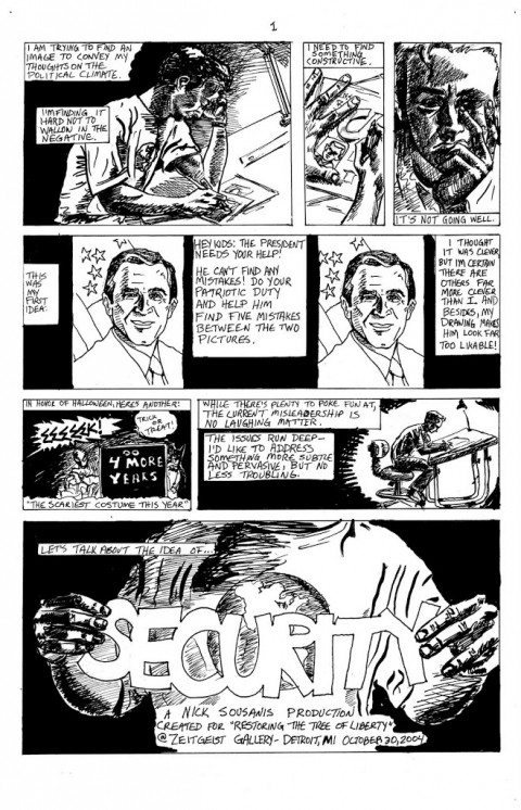 This was created for “Defending the Tree of Liberty,” part two of the exhibition at Detroit’s Zeitgeist gallery – which was post-Presidential Election 2004. Along with the piece for part one “Security”, i credit these pieces as getting me back into making comics after a rather lengthy hiatus. – N