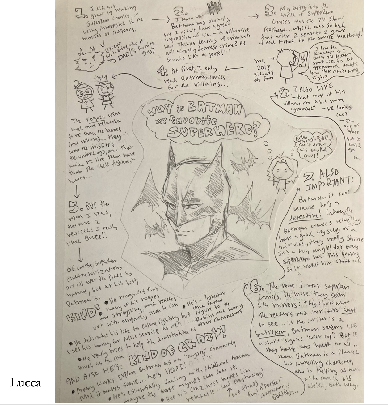 Course Outline: Introduction to the scholarly study of superheroes in comics (and other media), their origins, the kinds of stories and themes addressed throughout their history, along with prominent titles and authors. Students will engage with the material through creative projects, including drawn responses to comics and scholarly readings as well as creating their own superheroes/comics featuring their characters. We’ll explore why the comics medium is well-suited for the impossible action of superhero stories. Final projects will entail a deep dive on a critical aspect of superheroes, and students will present their thinking in comics, other visual media, or written work.